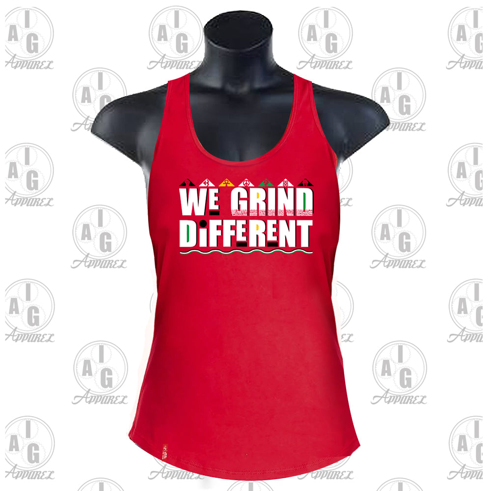 The We Grind Different Junior Tank. Drip + Culture. Our fly tribute to those that paved the way. A salute to our unique style that allows us to conquer obstacles with finesse. This is shirt is soft, streches to fit and very comfy. The We Grind Different. Run the yard..then..Run the World. Red Tank. White, Black, Gold and Green Lettering.