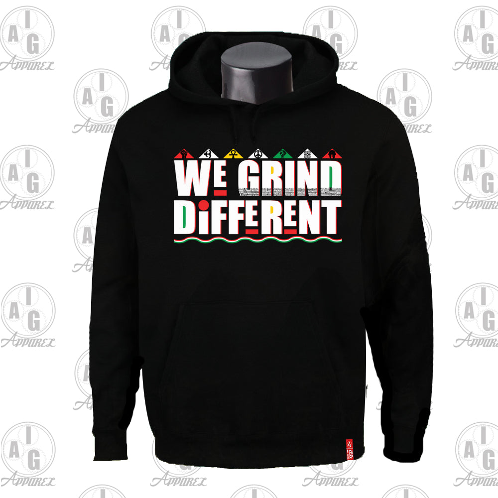 The We GRIND Different Hoodie is our tribute to those that paved the way. A salute to our unique style that allows us to conquer obstacles with finesse. Red Hoodie - Black, Green, Gold and White Text